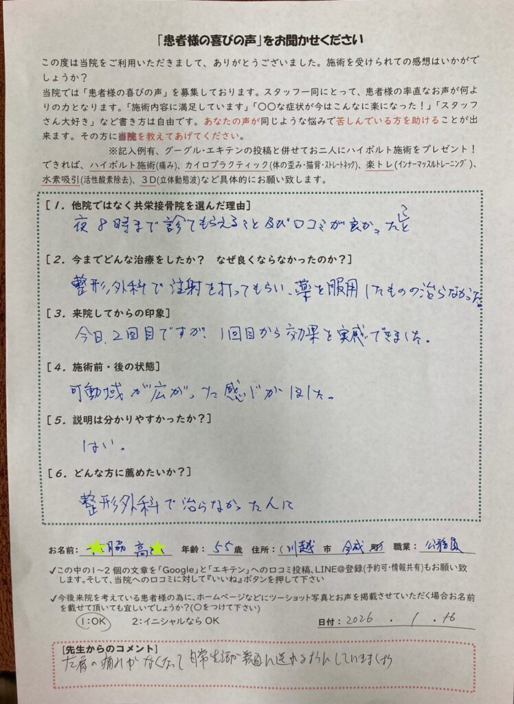 1回目から効果を実感でき、可動域が広がった感じがしました