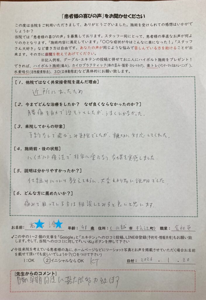 ハイボルト療法で非常に楽になり、効果を実感しました