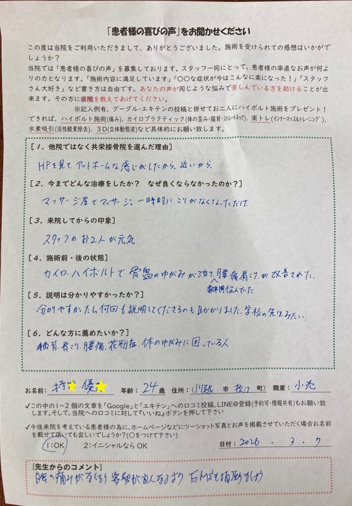 カイロ、ハイボルトで骨盤のゆがみが治り、数年間悩んでいた腰痛、肩こりが改善された。