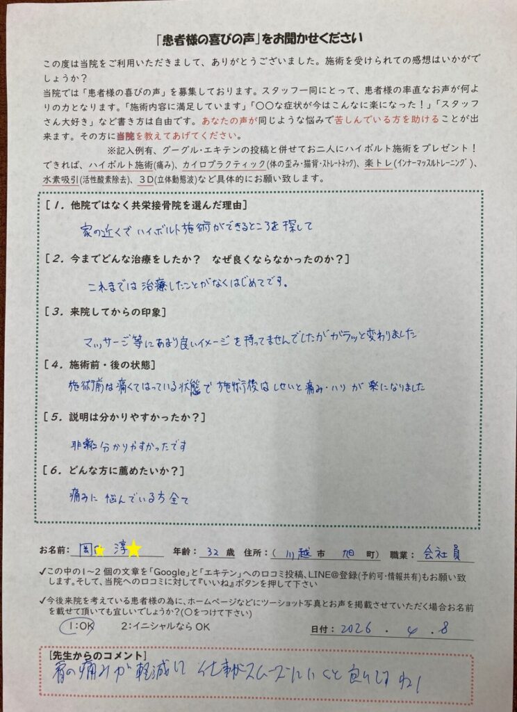 施術前は痛くてはっている状態で施術後はしせいと痛み・ハリが楽になりました